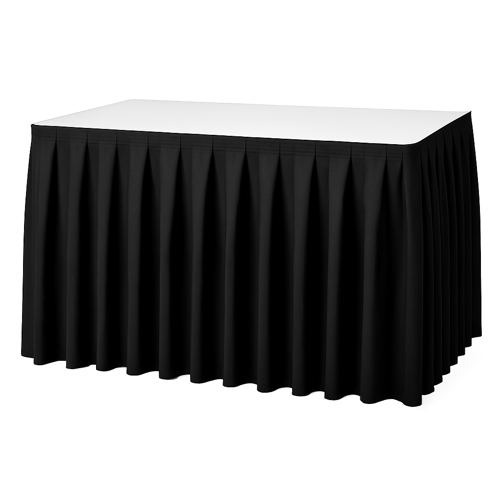 Give your event setup a professional edge with our Black Polyester Pleated Table Skirt. Designed for versatility and visual impact, this elegant skirt features structured box pleats and a wrinkle-resistant finish, making it ideal for banquets, weddings, hotel events, trade shows, and portable stage setups.